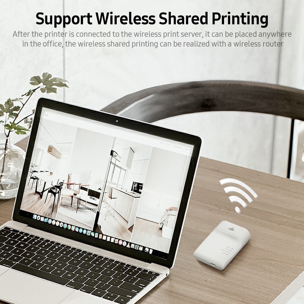 After the printer is connected to the wireless print server, it can be placed anywhere in the office. The wireless shared printing can be realized with a wireless router, not restricted by network cables.