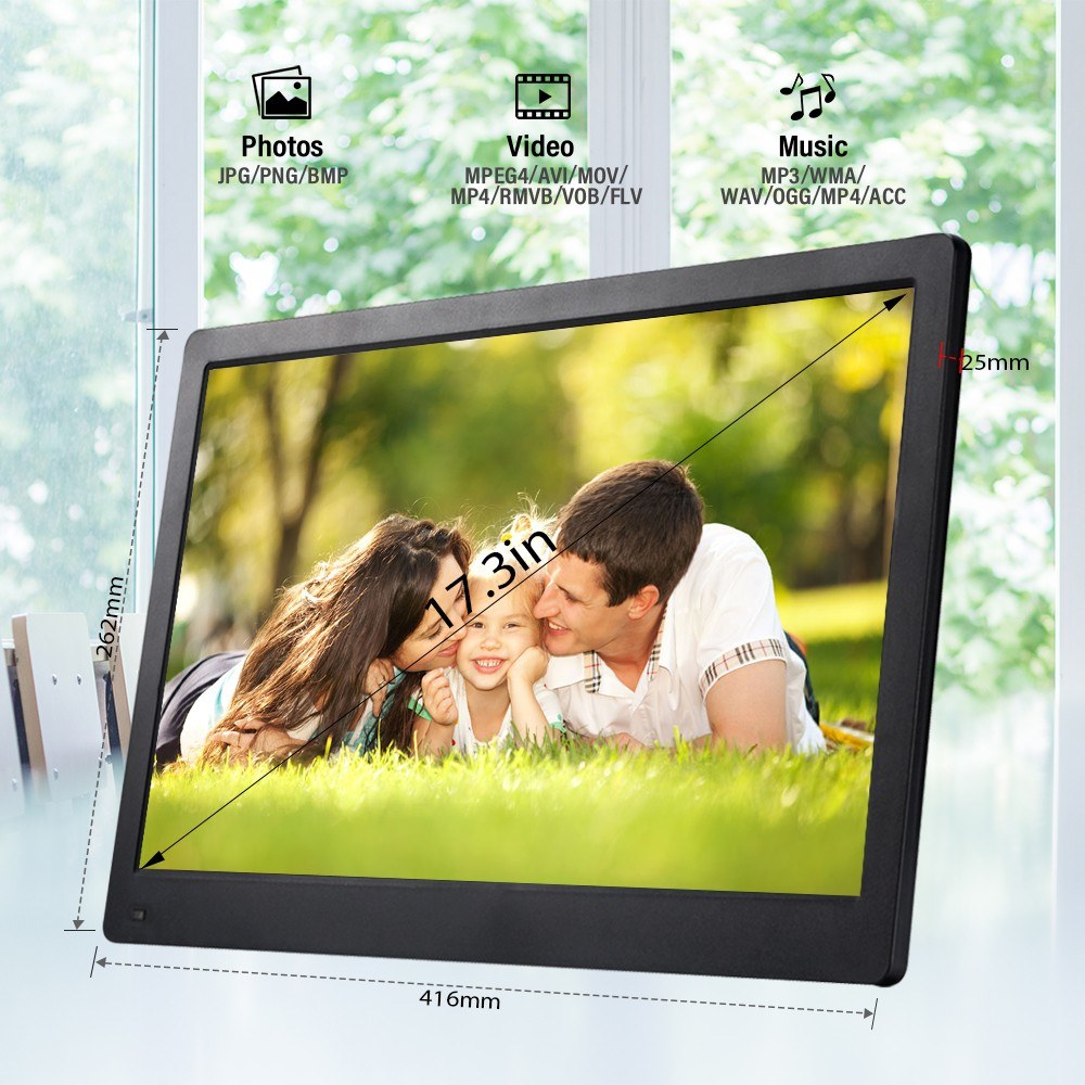 Andoer 17.3 Inch Digital Photo Picture Frame FHD 1920*1080 IPS Screen Support Calendar/Clock/MP3/Photos/1080P Video Player with 75*75mm Standard VESA Wall Mounting Bracket & 8GB Memory Card & Remote Control