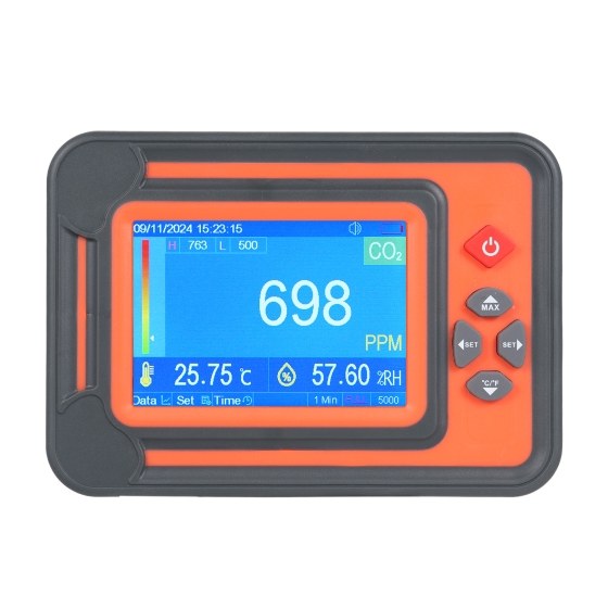 This instrument can measure and record CO2 concentration, temperature and humidity. 3.5" TFT full color display and desktop design. 6000 groups of data record and alarm setting. The user can set all parameters and view historical records from instrument direclty or compueter (two ways). All recording datas can download and export into computer.