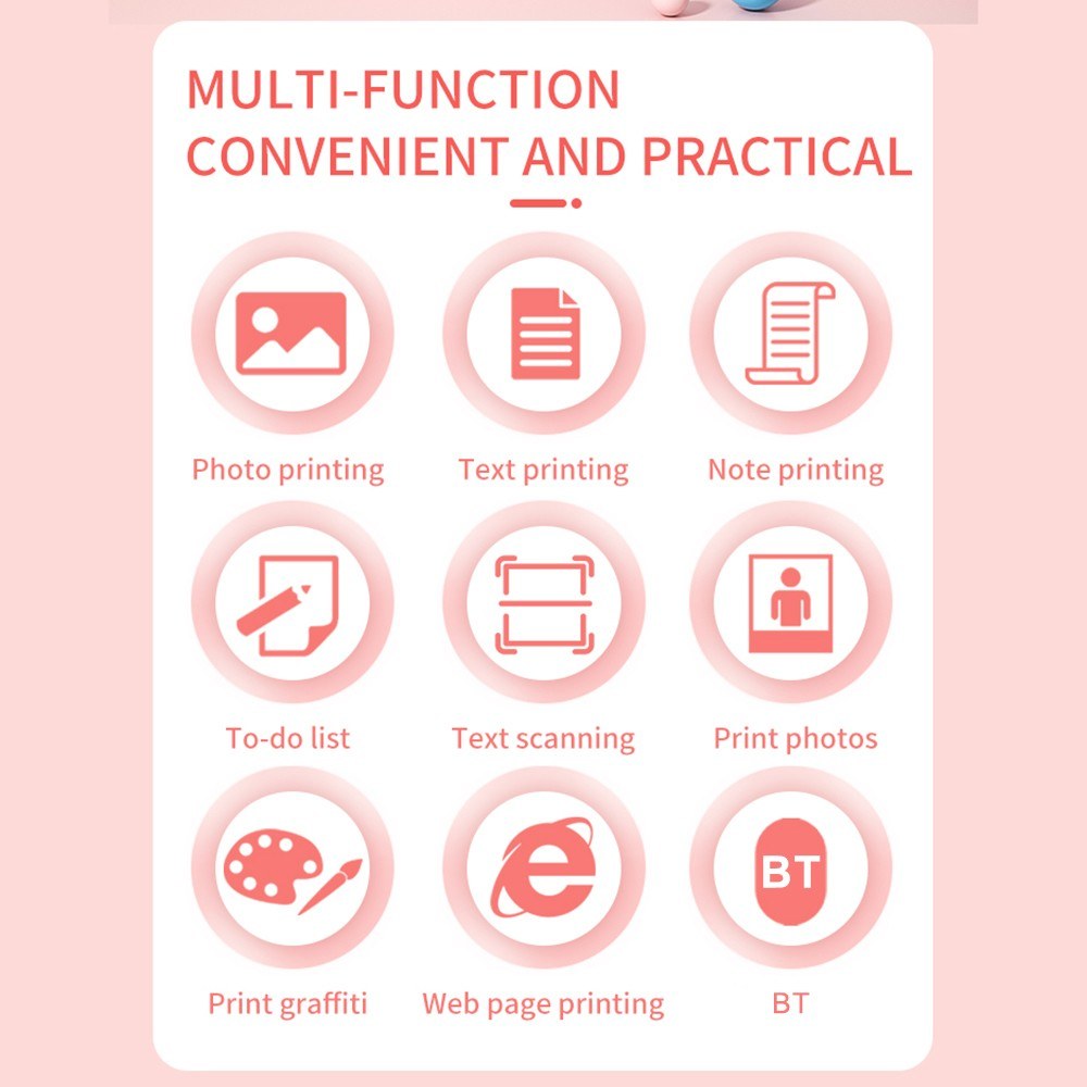 [Creative Pocket Printer with LED] This 58mm pocket-sized BT thermal printer is perfect for printing photos, sticky notes, scrapbooks, memos, labels, and more. With colorful LED light design, shining appearance during your printing time. It's a fun and practical tool for children, students, teachers, and DIY enthusiasts.